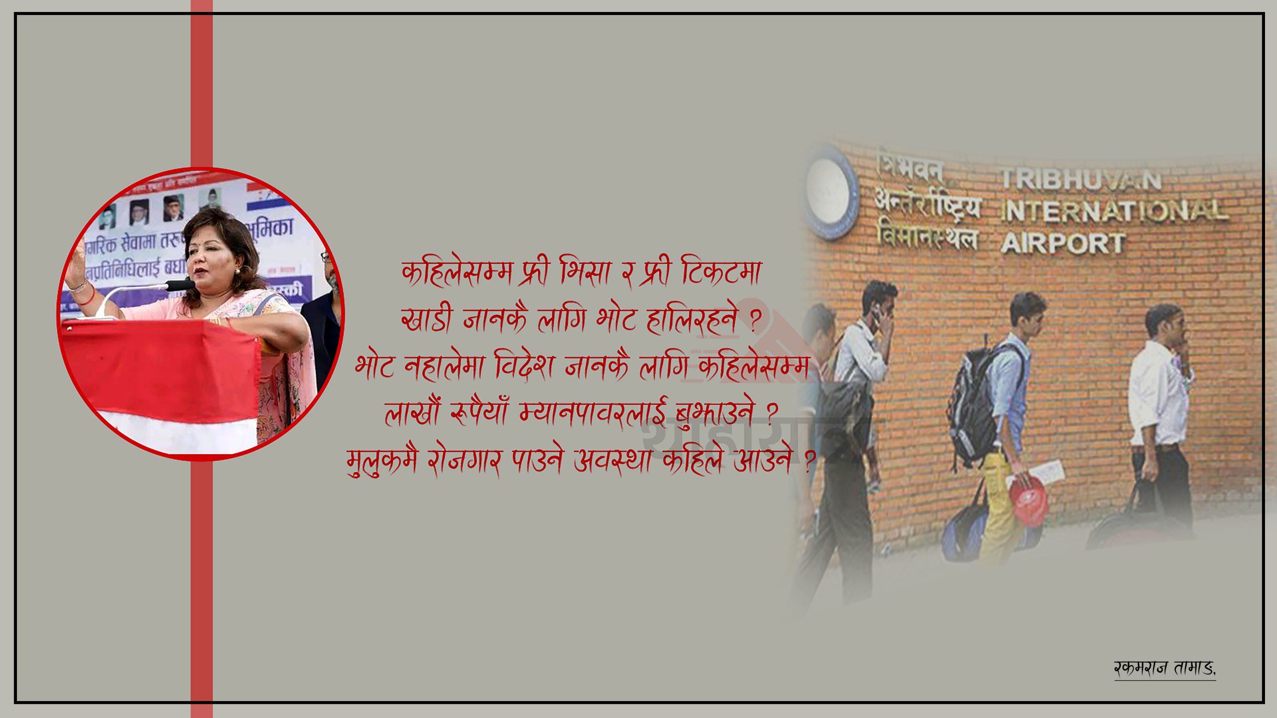 त्यसैले त यीनीहरुले प्रत्येक निर्वाचनमा फ्री भिसा र फ्री टिकटको आश्वासन दिइरहेका छन, र मुलुक विकासको खम्बा मानिने युवा शक्तिलाई विदेशीको गुलामी गर्न प्रोत्साहित गरिरहेका छन्। त्यसकारण स्वभाविक रुपमा आम जनमानसमा प्रश्न उठ्दछ कि जनताले कहिलेसम्म फ्री भिसा र फ्री टिकटमा खाडी जानकै लागि भोट हालिरहने? भोट नहालेमा विदेश जानकै लागि कहिलेसम्म लाखौं रुपैयाँ म्यानपावरलाई बुझाउने? मुलुकमै रोजगार पाउने अवस्था कहिले आउने? नेपालमै रोजगारी पाएको र मुलुक आत्मनिर्भर भएको कल्पनालाई यथार्थमा कहिले देख्न पाउने? र फ्री भिसा फ्री टिकटको सस्तो आश्वासन दिनु वा पाउनु वर्तमान राजनीतिक व्यवस्थाको सौन्दर्य नै पो हो की?