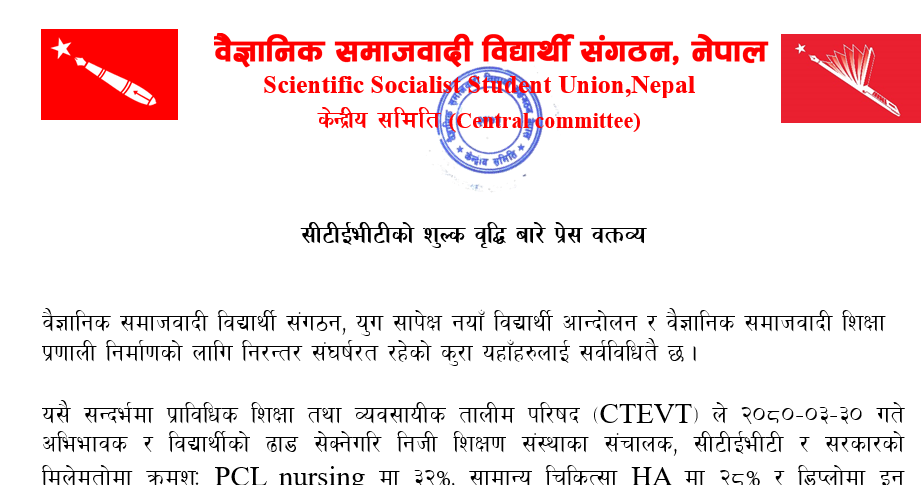 काठमाडौंः वैज्ञानिक समाजवादी कम्युनिस्ट पार्टी,नेपालको जनवर्गीय संगठन वैज्ञानिक समाजवादी विद्यार्थी संगठन,नेपालले सीटीईभीटीको शुल्क वृद्धि तत्काल खारेज गर्न माग गरेको छ । आइतबार एक प्रेस विज्ञप्ति जारी गर्दै संगठनले वृद्धि गरिएको शुल्क खारेज गर्न माग गरेको हो ।